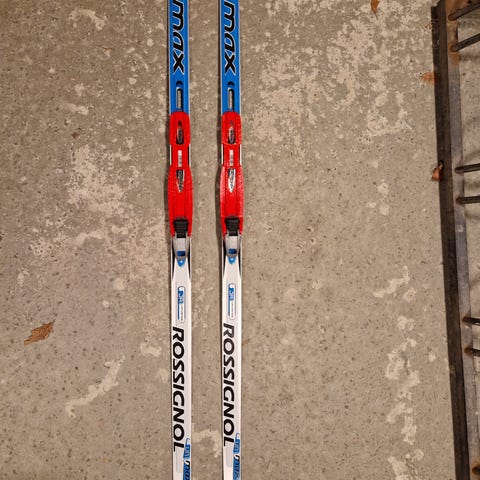 Pakke med flere par langrennski med bindinger. Skiene har ulike lengder, farger og design, og ser ut til å være fra forskjellige merker og modeller. De egner seg til klassisk langrenn og kan passe for barn eller unge, avhengig av lengde og høyde på bruker. Bindingene er montert på skiene. Skiene kan brukes til trening, skilek eller turbruk. For eksakt lengde på hvert par bør de måles fysisk.