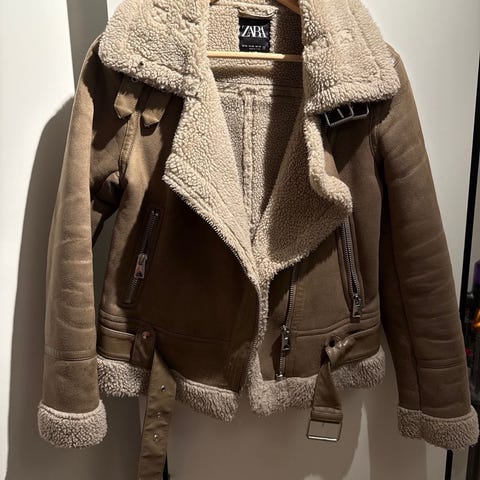 Zara vinterjakke i beige fuskepels for dame i størrelse XS. Jakken har mykt, teddy-lignende fôr og detaljer i fuskepels langs krage, ermer og nederkant. Modellen har skrå glidelås i front, to glidelåslommer og belte nederst. Egnet som ytterjakke i kaldere vær.
