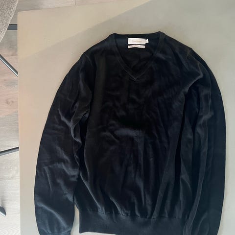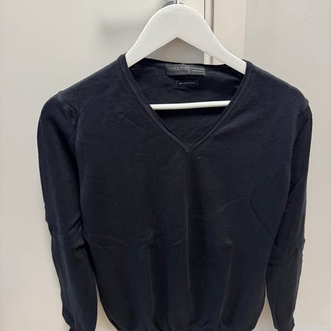 Dressmann genser for herre i størrelse S. Genseren er svart og laget av 100 % merinoull. V-hals og langermet modell som passer godt til bruk alene eller over skjorte til hverdags og jobb.
