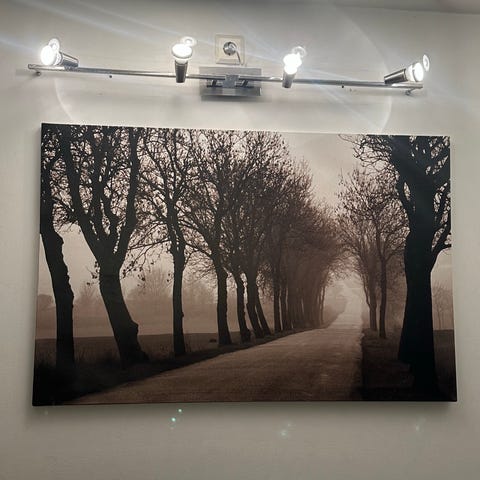 Stort og dekorativt bilde fra IKEA, serien Björkstad. Ramme i aluminium og lerret med motiv av en hengebro inn i jungelen – gir flott romfølelse og en stemningsfull atmosfære.