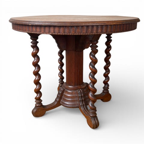 Rundt sidebord med dekorert messingplate i gullfarge på toppen, beskyttet av en rund glassplate.