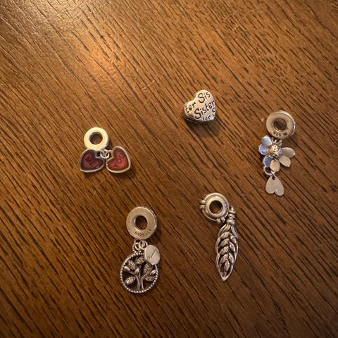 Ulike charms for armbånd - pris vist på bilde per stk. De er nesten ikke brukt, ingen synlige merker, nylig renset. Noen av de er laget av ekte muranoglass og de andre er kun sølvbelagt. Passer til Pandora f eks. Sendes i fin pakning med polerings klut.