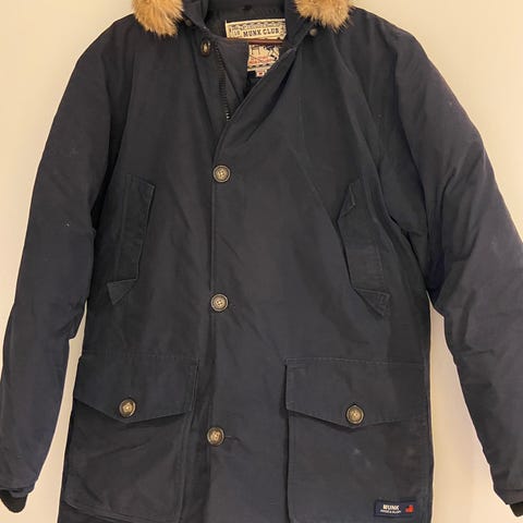 Fargen er en klassisk blå tone med svært lite falming, og anorakken fremstår som pent brukt og godt bevart. Ingen påfallende skader eller slitasje utover normale, lette bruksspor. Pelskragen er i god stand, og kan enkelt tas av og på med trykknapper.