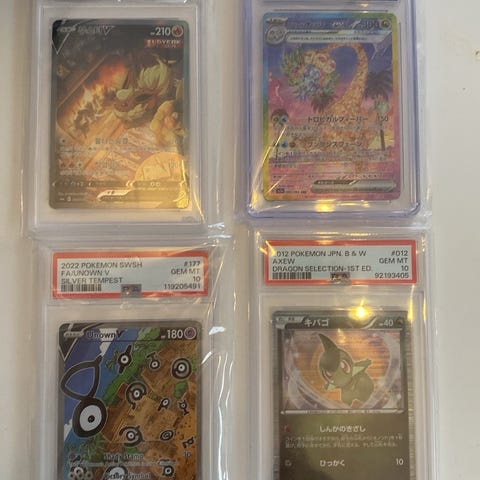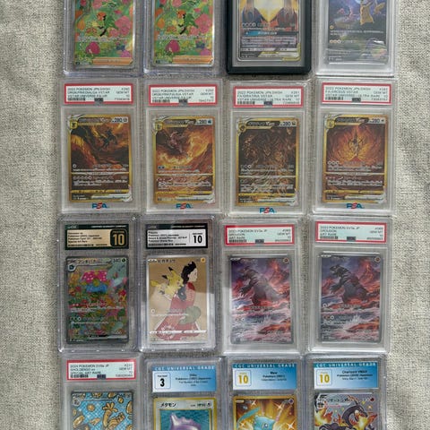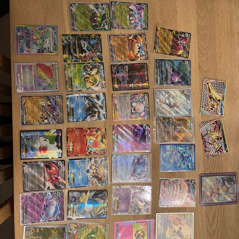 Pokémon samlekort blandet lot med ulike holo- og full art-kort. Bildene viser både enkeltkort i plastbeskyttelse og kort oppbevart i samlepermer. Kortene ser ut til å være fra forskjellige serier og utgivelser innen Pokémon Trading Card Game. Egner seg for samlere av Pokémon-kort som ønsker en variert samling med flere typer motiv og design.