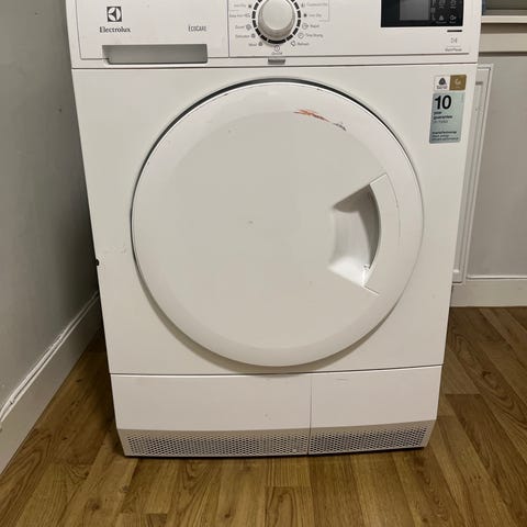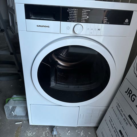 Grundig kondens tørketrommel i hvit utførelse. Tørketrommelen har frontmatet dør med stort glassvindu og trommel i metall. Kondensløsningen samler opp fuktighet i en beholder i stedet for å lede den ut via ventilasjon. Apparatet har elektronisk betjening med programvelger og display på fronten. Egnet for innendørs plassering der det ikke er tilgang til fast avtrekk.