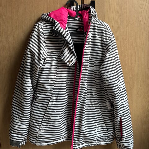 L1 snowboardjakke for dame i størrelse M. Jakken er turkis med kontrastdetaljer og mønstret innerfôr. Den har hette med snøring, flere bryst- og sidelommer med glidelås samt justering nederst. Egnet som ytterjakke ved ulike aktiviteter
