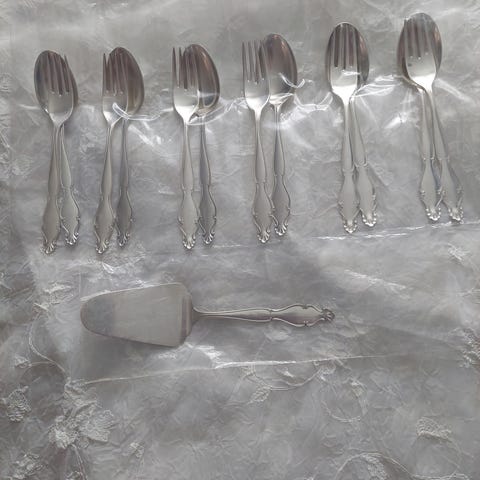 Hardanger Bestikk Nina kakesett i rustfritt stål. Settet består av kakespade og små kakegafler med dekorert skaft. Egnet til servering av kaker og desserter ved borddekking og selskap. Produsert i rustfritt stål merket «Hardanger 18/8 Norway» på skaftet. Fikk i gave for mange år siden men har aldri brukt dem og har bestemt meg for å selge dem. Kan hentes i Trondheim eller sendes