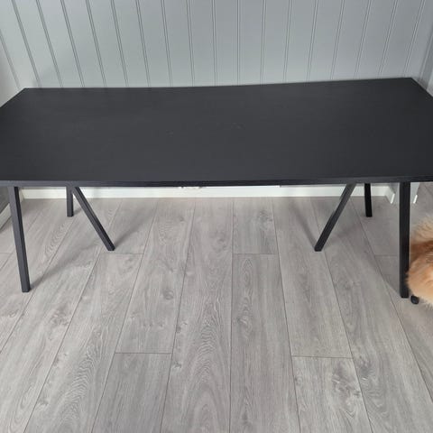 Bordet er pent brukt, men har noen bruksmerker i form av skjolder i bordplaten (se bilder). Dette er kosmetisk og har ingen betydning for funksjon eller stabilitet.