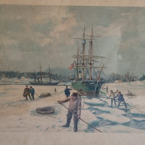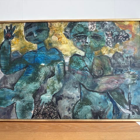 Vintage kunstverk, etsning, signert med "S'aunj 86" nederst til høyre. Det er nummerert som 42/250 nederst til venstre, noe som indikerer at det er en del av et begrenset opplag på 250 eksemplarer. Ukjent kunstner.