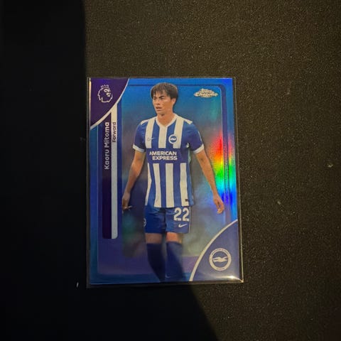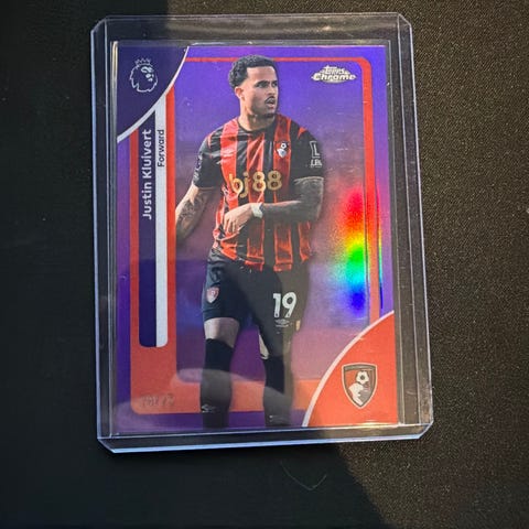 Topps Chrome Carlos Baleba fotballkort med motiv av midtbanespiller for Brighton & Hove Albion. Kortet er en oransje parallell, nummerert 21/25 på forsiden. Baksiden har spillerinformasjon og klubb- og Premier League-logo. Leveres i plastbeskyttelse slik det vises på bildene. Åpen for bud