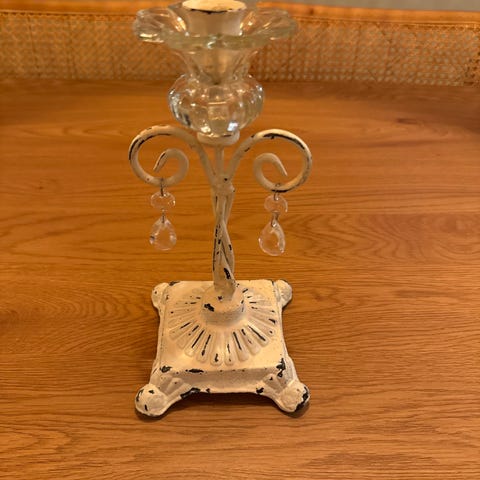 Vintage Shabby Chic 5 armet lysestake hvit metall og glass 45 cm