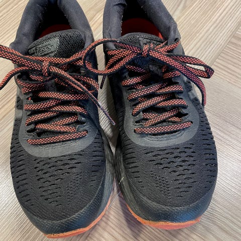Asics gel-kayano i sølv, hvit og rød. Str.37