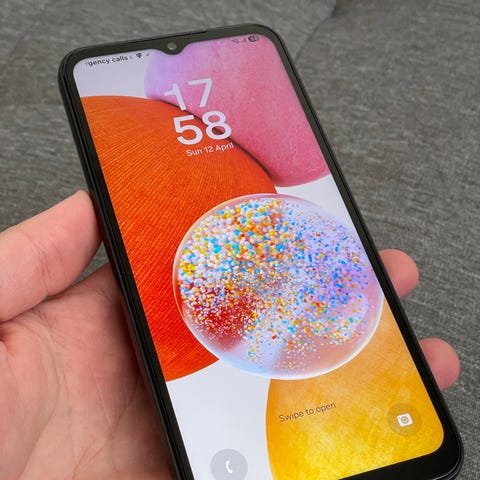 Samsung Galaxy A12 mobiltelefon med 64 GB intern lagring. Telefonen har berøringsskjerm på forsiden og flere kameraer med LED-blits på baksiden. Støtter nedlasting og lagring av apper, bilder, video og andre filer innenfor lagringskapasiteten på 64 GB.