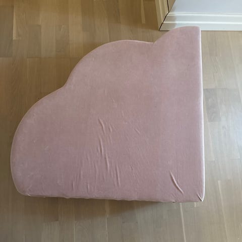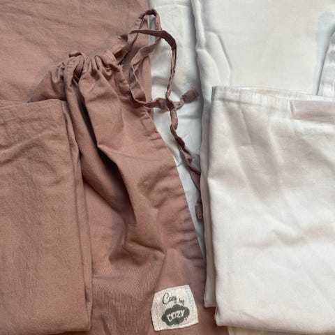 Sebra sengekant til sprinkelseng i rosa farge. Sengekanten er vattert og quiltet med buet mønster og har knytebånd langs kanten for feste til sprinkelsengen. Et par av trådene for festing av beskytteren er røket, men ellers er den i god stand.