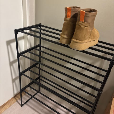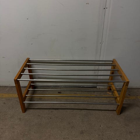 Skohylle selges i forbindelse med flytting. Brett til å ha under for våte sko kan følge med. 2 etasjer.
