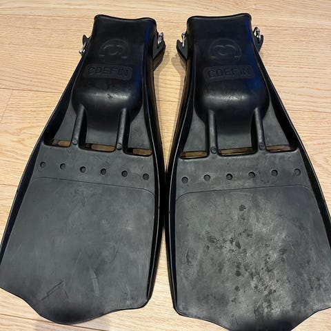 Navy Champion svømmeføtter i svart gummi i størrelse 43–48 (tilsvarer ca. 9–13). Modellen har åpen hæl med metallspenner for feste av stropp. Bladene er brede og stive for god kraftoverføring i vannet. Egnet til bruk ved dykking, snorkling eller svømming der det er behov for robuste svømmeføtter i større størrelse.
