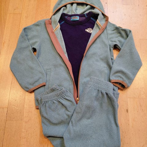 sett med barneklær til gutt i størrelse 110. Inneholder én ensfarget bukse, én bukse med mønster og to langermede gensere med motiv. Klærne har ulike farger (flerfarget) og er egnet til hverdagsbruk. Passer til gutt rundt størrelse 110.
