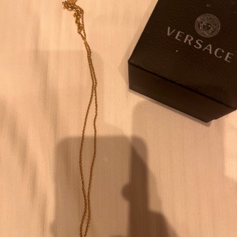 Versace smykke i gullbelagt materiale for unisex. Smykket har en kraftig kjede og rundt anheng med karakteristisk Versace-motiv. Leveres med original Versace-emballasje slik som vist på bildene. Brukt kun et par ganger.