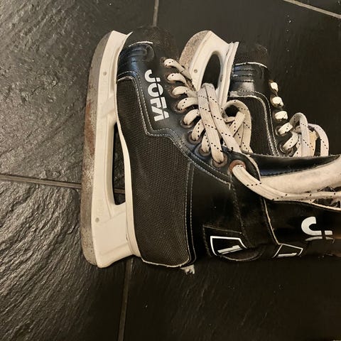 Jofa ishockeyskøyter for barn i størrelse 36. Skøytene er i hovedsak svarte med hvite lisser og hvit skøytestålholder. Overdelen er laget i syntetisk materiale med polstret ankelparti for støtte. Egner seg til ishockey og annen bruk på is for barn med skostørrelse 36.