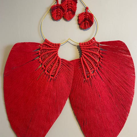 Selger et sett med 4 håndlagde makramé-brikker i hjerteform. Størrelse ca. 20x17cm.