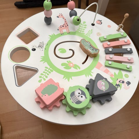 Aktivitetsbord i tre i nydelige pastellfarger. Mange morsomme aktiviteter som stimulerer motorikk og lek.