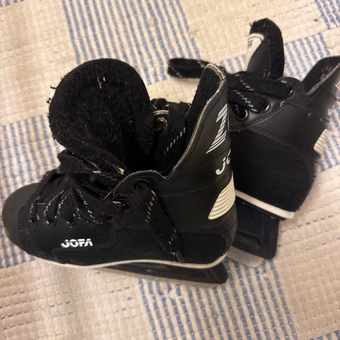 Jofa ishockeyskøyter for barn i størrelse 32. Klassiske svarte skøyter med hvite lisser og hvit skøytestålramme. Overdelen er i syntetisk materiale med polstret ankelparti for støtte rundt foten. Skøytene er egnet til ishockey og generell bruk på is for barn med skostørrelse rundt 32. Stålklingen bør slipes før bruk etter behov.