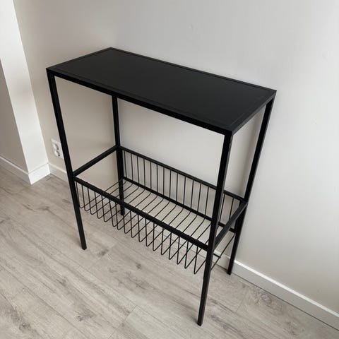Selger et lite stativ / hylle i sortmalt metall. Kan brukes som f.eks skostativ, nattbord, hylle etc.