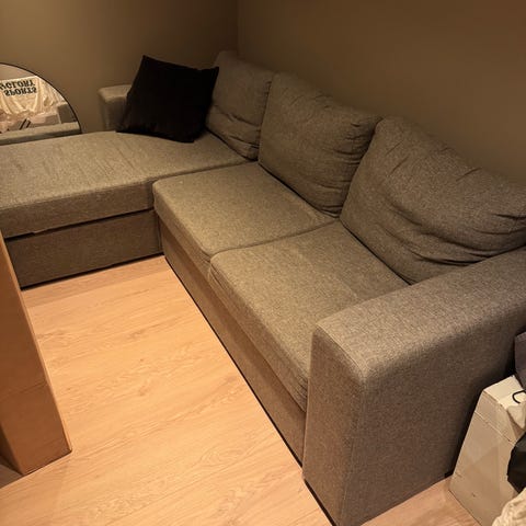 Helt fin sovesofa, en synlig flekk samt et brennmerke .Alt helt Ok ellers. Den er demontert men må hentes før lørdag 14 klokken 11
