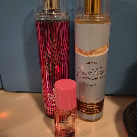 - Elizabeth Arden Green Tea Lychee Lime, godt over halve flasken igjen! Jeg liker denne duften veldig godt, den er ikke for sterk, behagelig og lukter akkurat det den heter: Grønn te og lychee.