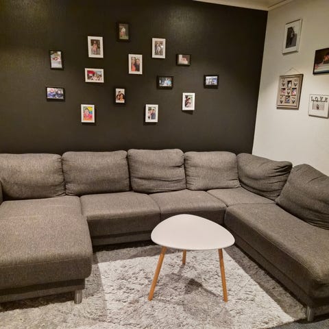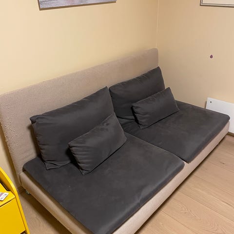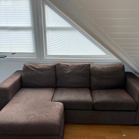 Setedybde 75 cm, sittehøyde 44 cm. Et brennmerke på ene ryggputen, se bilde. Puten kan snus andre vei, slik at det skjules. Putetrekkene kan tas av og vaskes i vaskemaskin. Må hentes og bæres.
