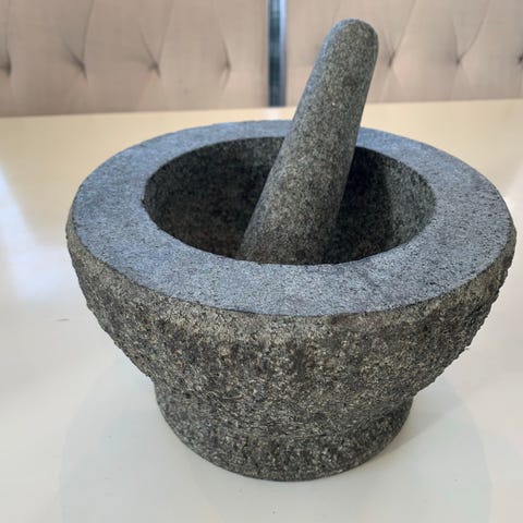 Tung og stødig morter i kleberstein. Dekorert på kanten, «signert» under. Stamperen mangler.