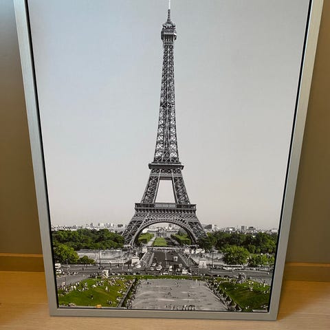 Bilde med bymotiv fra New York, med utsikt over Manhattan og Empire State Building. Veggbildet er rektangulært og har en lys ramme. Passer som veggdekor i stue, soverom, kontor eller gang. Materiale på motiv og ramme er ikke spesifisert av selger.