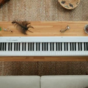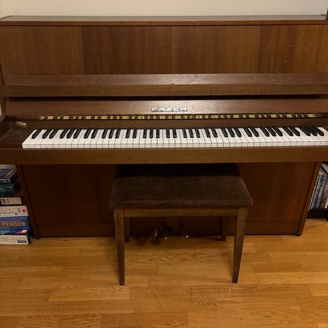 Instrumentet står på fast stativ og følger med matchende krakk. Passer til øving hjemme eller som god underholdning. Tangentene er i lys farge med svarte toner, og pianoet har notebrett over tangentene. Strømforsyning følger med etter det som vises på bildene. Det er ett barne piano som er 60cm i høyden og 90 cm i bredde. Det er altså ikke særlig stort, men passer godt. Den matchende krakken er 35 cm i høyden og 40 cm i bredden. Instrumentet må hentes hos selger.