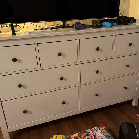 En klassisk hvit kommode selges, er brukt og har noen synlige merker. Den mangler også en knapp til en skuff:) må hentes, bæring og eventuell demontering på kjøper selv fikse!