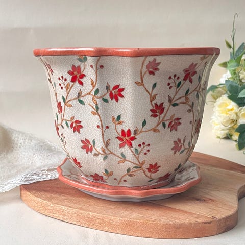 søkeord: interiør dekor dekorasjon grønn gul gult grønt burgunder rødt rød vinrød blomster potte retro keramikk porselen interiørdesign dekorativ potteskjuler antikk retroinnredning innredning blomsterdekorasjon interiør unik design sjelden blomsterpotte stil nostalgisk dekor potteskjulere dekorasjon mønster mønstret vase vaser innendørs