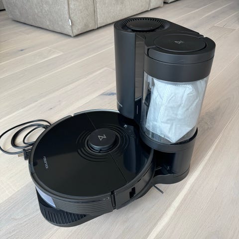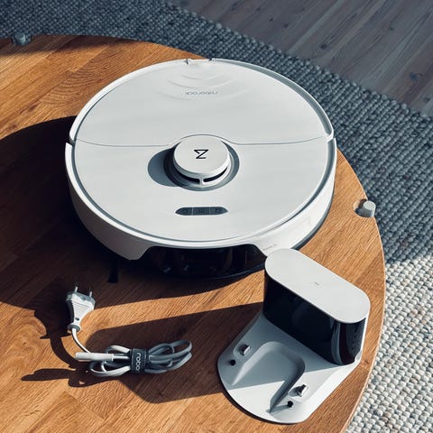 Robotstøvsugeren leveres med ladestasjon og strømkabel. I tillegg følger det med tilbehør som vaskemopper, sidebørste, vann og moppebeholder og ekstra filter.