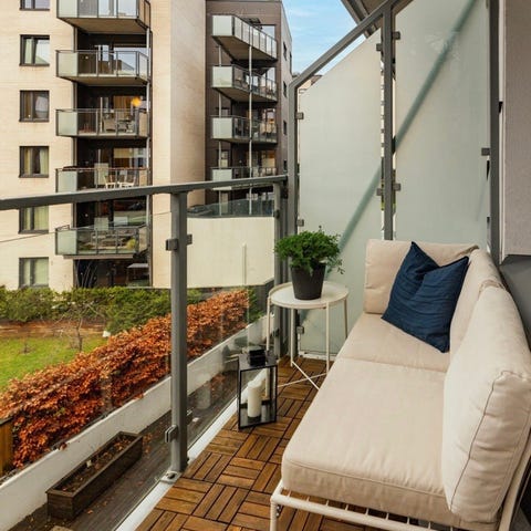 IKEA Segerön 3-seters utesofa i hvit metall med beige puter (Frösön/Duvholmen). Sofaen består av tre moduler som kan settes sammen til en tre-seter. Ryggen har snortrekk, og setet er i metallgitter. Mål per modul er ca. 74 cm dybde, 60 cm bredde og 76 cm høyde, med sittehøyde på ca. 40 cm. Egnet for bruk på balkong, terrasse eller i hage.