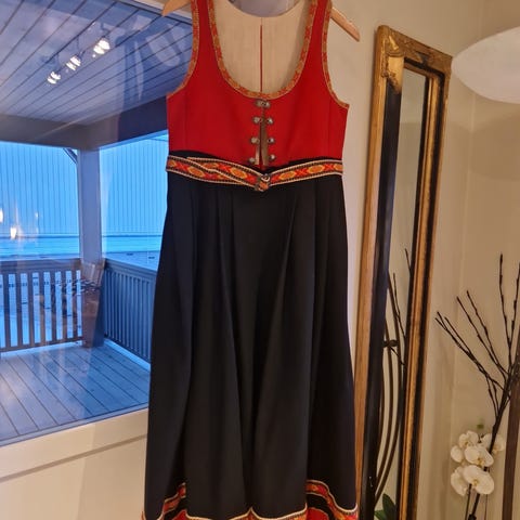 Kjøpt ny av meg for noen år tilbake. Veldig pen stand. Ta kontakt for bilder/ eventuelt ønske om å komme å se på den i Drammen. Det er sydd på noen maljer på hver side som hører til Telemark bunadene, dette kan enkelt sys av. Bunaden er sydd til min høyde ca 168, og jeg er en XS+ smal i midjen. Kan også passe en S. Selges da den bare blir hengende til pynt.