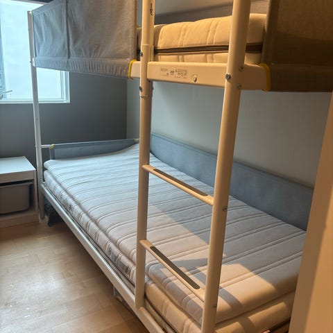 IKEA køyeseng i metall med grå overflate. Sengen har to liggeplasser over hverandre og integrert stige, og sengen oppe har sengehest for økt sikkerhet. Selges med originale madrasser (ca. 90 x 200 cm). Rammen er laget av metallrør med pulverlakkert finish. Egnet for barn fra 6 år og oppover på overkøye, i tråd med merkingen på sengerammen.