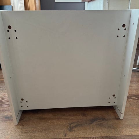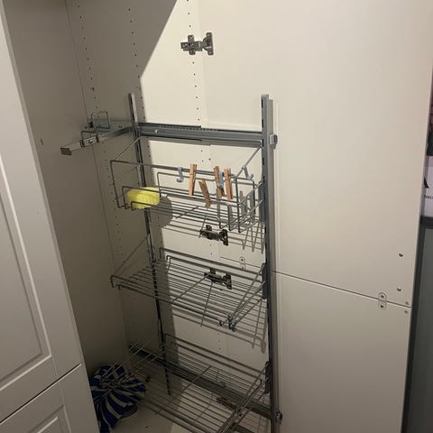Uttrekkbart søppeltønnestativ fra Clas Ohlson. Passer normalstor søppeltønne. Skinnene monteres i bunn på skapet. Må hentes.