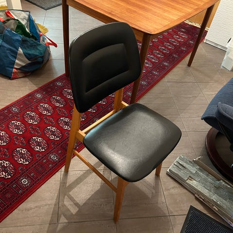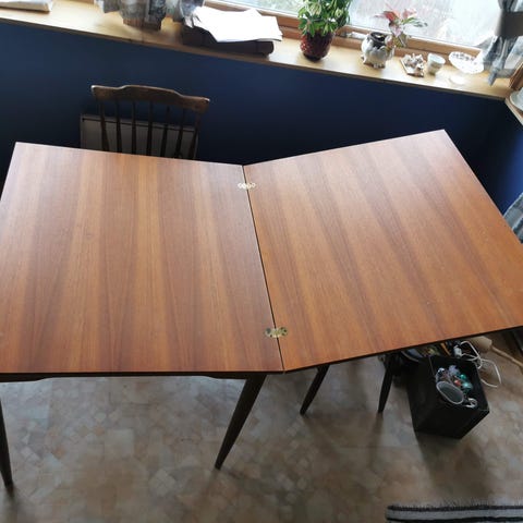 Fint brukt teakbord med seks stoler selges. Har stått på lager noen år, og har en del bruksmerker, så treng nok et nytt lag med olje. Den ene stolen er knukket i ryggen, men tapet sammen før lagring. Vil tro den kan limes. Følger med to innleggsplater i bordet. Et lite hakk i den ene bordplata.