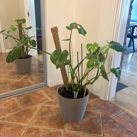 Monstera deliciosa potteplante med grønne, flikete blader. Planten står i plastpotte med jord og har flere stengler med både yngre og eldre blader. Egner seg som inneplante i stue eller andre rom med indirekte lys. Kan plasseres på bord eller gulv, eventuelt med støtte etter hvert som den vokser seg større.