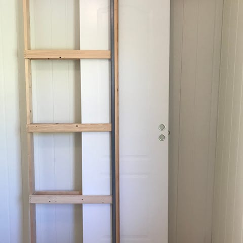 Delvis hvitmalte sammenskrudde hylleseksjoner i furu gis bort.