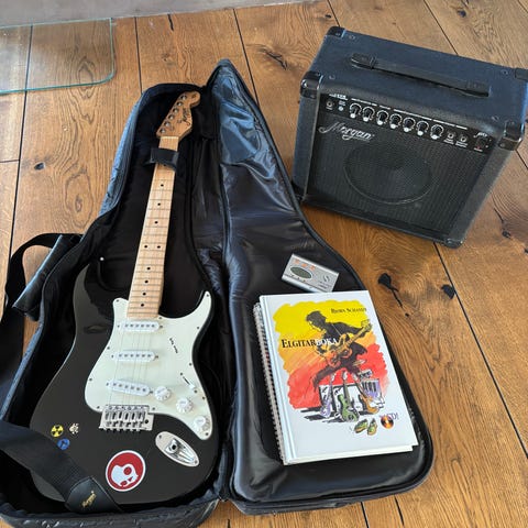Elektrisk gitar med tilbehørspakke. Settet inkluderer en elektrisk gitar, bærebag/gigbag for trygg transport og oppbevaring, instrumentkabel samt en Roland Cube 30X gitarforsterker. Forsterkeren har flere kontroller og innebygde effekter, egnet for øving hjemme eller i øvingslokale. Kabelen kobler gitaren til forsterkeren. Dette er et komplett oppsett for elektrisk gitar med nødvendig grunnleggende utstyr.