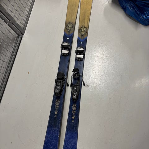 Selger et par K2 Spy twin-tip ski med Marker M 9.0 MOD bindinger. Skiene er litt eldre men fungerer fint til lek, parkbruk eller som rimelige førstegangsski/hytteski.
