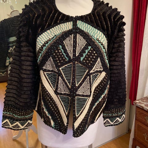 En Hallhuber jakke for dame i størrelse 36. Jakken er laget i bomull og har et flerfarget mønster med geometriske detaljer på for- og ermepartier. Kort, åpen modell uten synlig lukking i front. Strukturert overflate med dekorative sømmer og påsydde elementer. Passer som et lett ytterplagg eller som et lag over topp eller kjole.