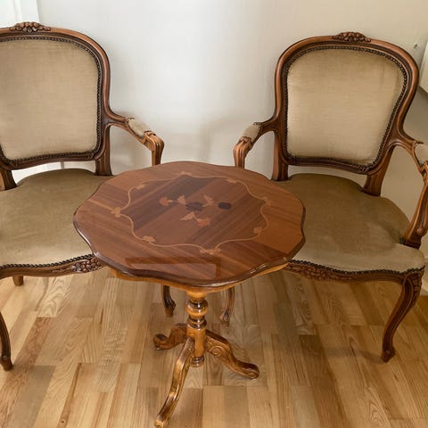 Stoler og bord selges sammen, men kan også kjøpes hver for seg. (1600kr for begge stolene og 1400kr for bord)