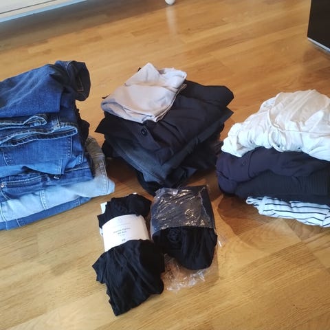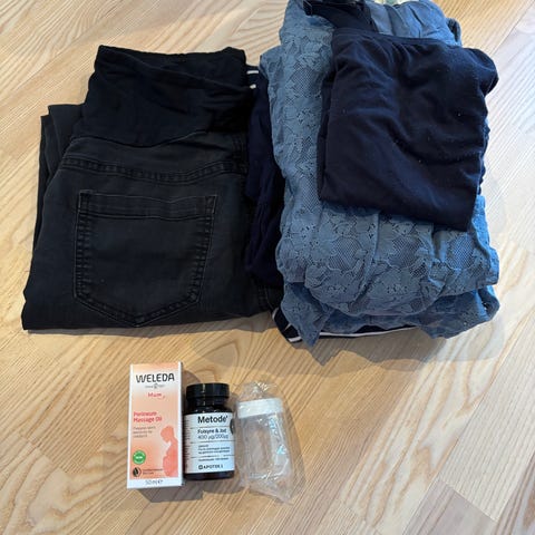 Inkludert i pakken kan du få en uåpnet massasjeolje fra Weleda som er ment for å forberede og mykne før fødsel (kjøpte litt for mange slike). Du kan også få folsyre/jod-tabletter i pakken, men denne er åpnet og tatt et par tabletter fra. Bare si ifra om jeg skal ta noe av dette ut fra klespakken. :)