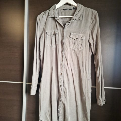 H&M hverdagskjole for dame i størrelse 38. Kjolen er grå og laget i polyester. Den har en enkel, rett passform med trekvartlange ermer. Stoffet har en lett struktur, og det er glidelås bak for lukking. Egnet som hverdagskjole eller til enkle anledninger.