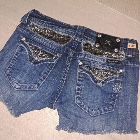 Miss Me denimshorts for dame i blå vask. Shortsen er i størrelse 38 (merket med midjemål 29) og er laget i denim. Modellen har råkant nederst på bena, kontrastsømmer og dekorative baklommer med broderi og metall-detaljer. Klassisk 5-lommersmodell med beltehemper og knapp- og glidelåslukking foran. Passer til hverdagsbruk i varme perioder. Small til medium